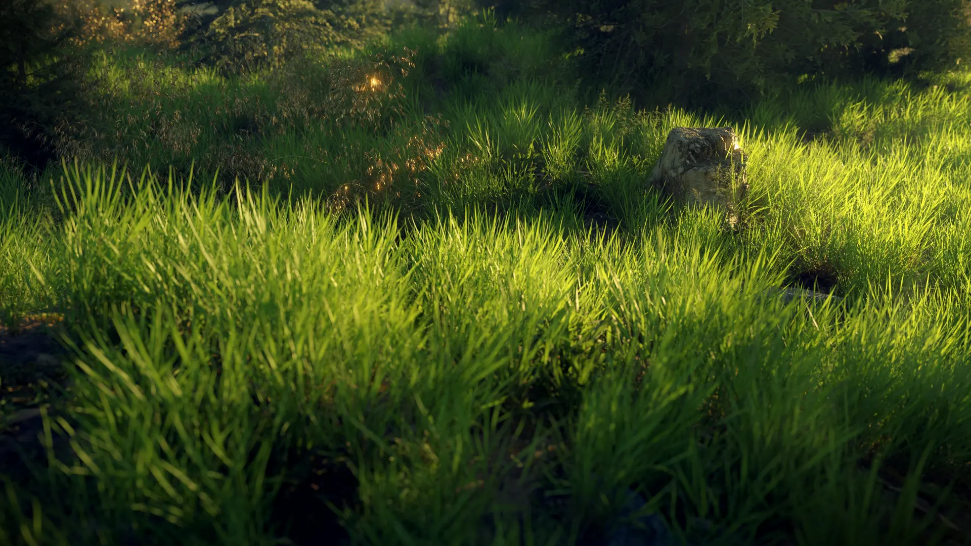 This one was my very first nature scene. It's a simple grass field in the setting sun. This was the first time I used external models like grass and trees, and it opened the door for me to create much more elaborate landscapes in later projects. I spent a lot of time fiddling with the scattering and arrangement of the grass to get it looking natural.